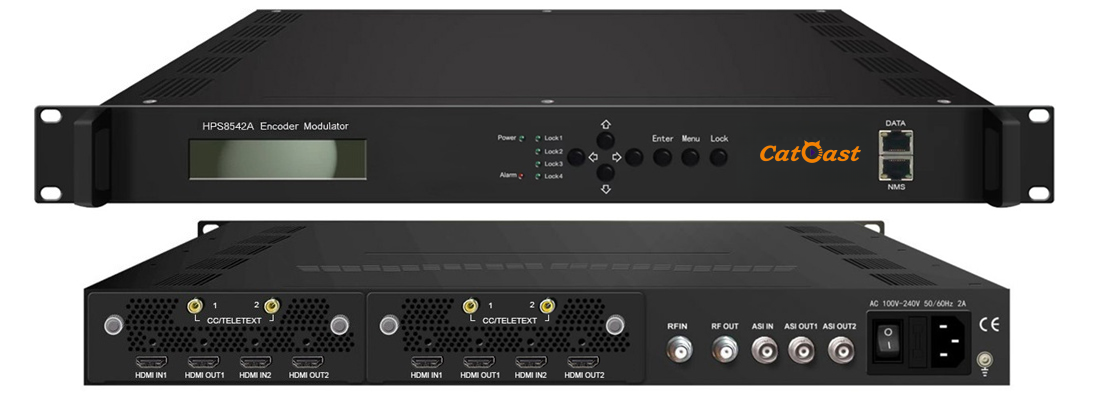 HPS8542A V2 4K encoder modulator is Catcast’s new breakthrough all-in-one devices which integrate encoding (H.264 /H.265) and modulating to convert V/A signals into Digital RF output. It is equipped with 4 HDMI channels input and 1 ASI input(optional) and output via 2 ASI ports(optional) and 1 DATA (4*SPTS or 2 or 4 MPTS--as per carrier numbers)output over UDP, RTP/RTSP. The latency has been greatly reduced to achieve an extremely low value from the encoding progress to the decoding terminals.
